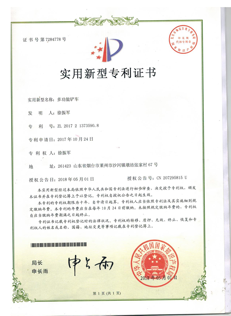 • 獲得“多功能鏟車抓掉挖一體機”專利證書,開始生產(chǎn)兩頭忙,攪拌斗裝載機,同年更名萊州巨浪機械有限公司